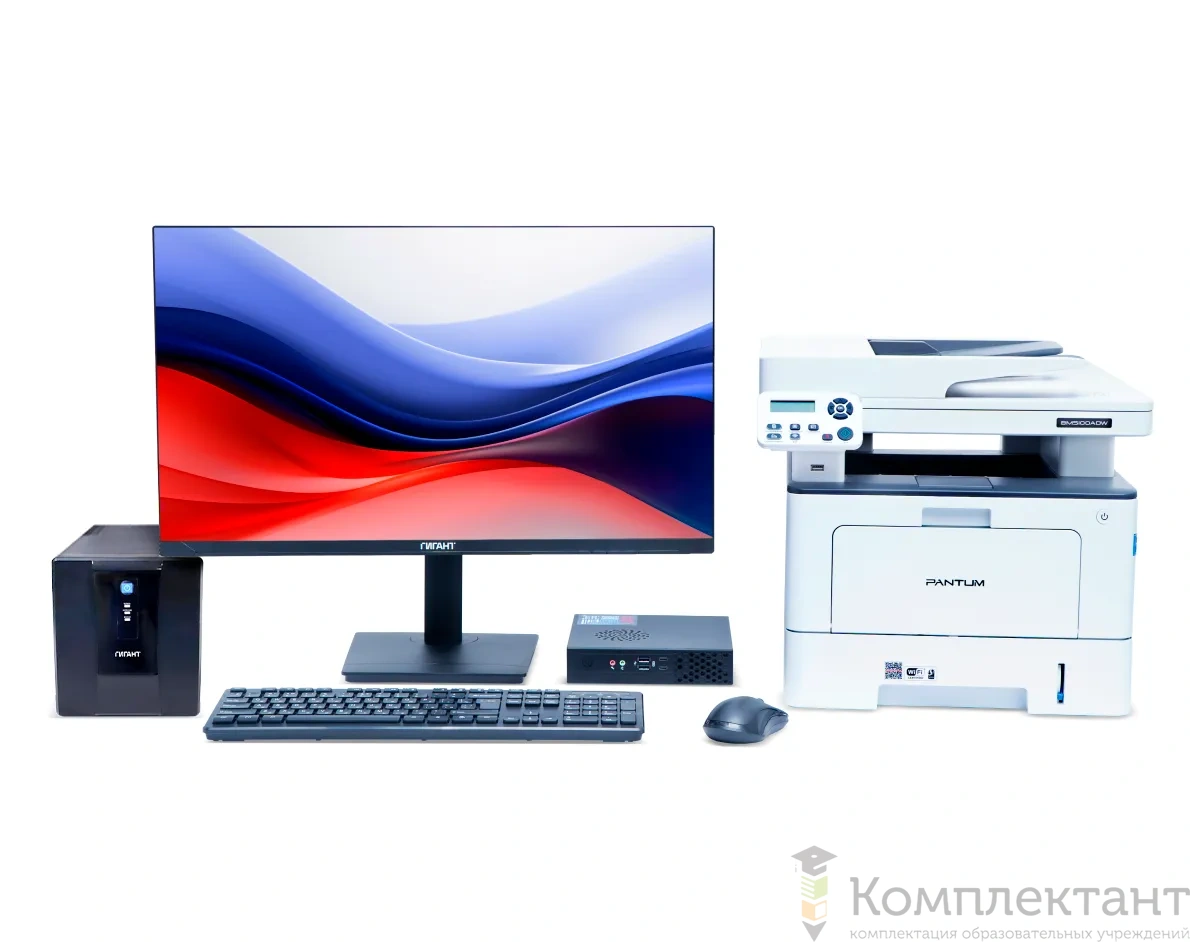 Полноценное рабочее место для преподавателей и администрации учебных заведений включает мощный компьютер, качественный монитор и удобные устройства ввода. Комплекс полностью готов к использованию в образовательном процессе.