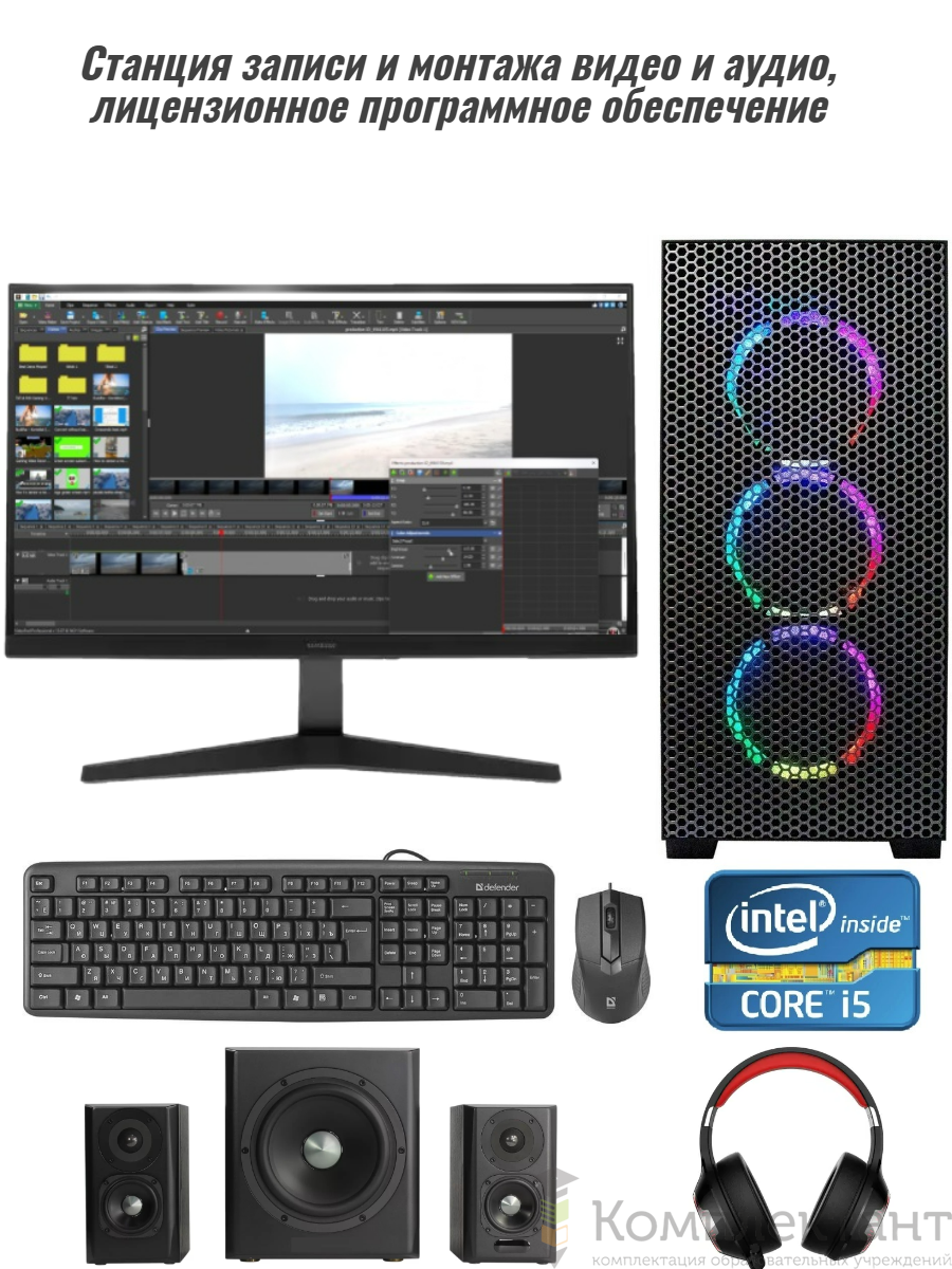 При сборке компьютера, на котором выполняется монтаж звука и видео, объединяются специализированные оборудование и программное обеспечение. ПО для записи и монтажа звука на рабочей станции для монтажа звука, используется для записи звука, управления звучанием с помощью микширования и спецэффектов, а также финализации записей для публикации. ПО для записи и монтажа видео используется для вырезания, копирования, комбинирования и редактирования фрагментов видео. С помощью этого ПО можно также добавлять в видео спецэффекты. Для использования ПО для монтажа звука и видео в комплект входит следующее оборудование.