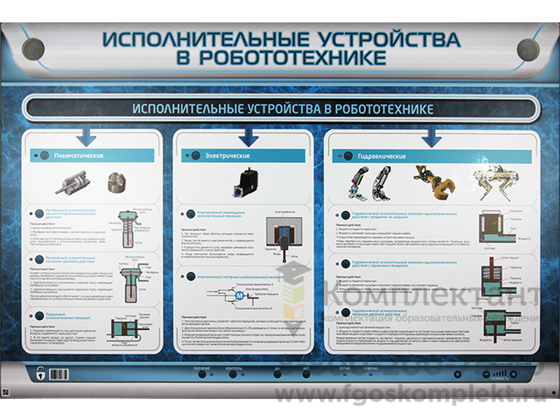 Электрифицированный стенд представляет собой панель с раздельной световой индикацией, с размещенной информацией о исполнительных устройствах, использующихся в робототехнике – пневматических, электрических и гидравлических. Стенд предназначен для ознакомления с исполнительными устройствами в робототехнике.