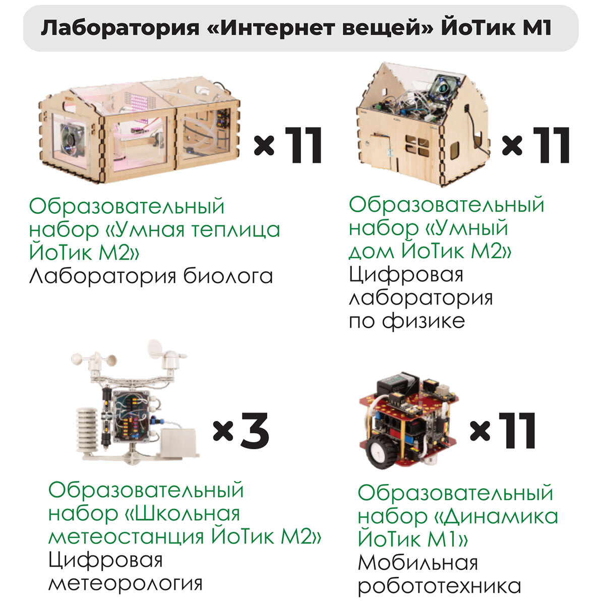 Комплект оборудования «Лаборатория Интернет вещей ЙоТик М1» включает 36 образовательных наборов для изучения компетенции «Интернет вещей». Позволяет проводить одновременные занятия для группы из 20 человек.