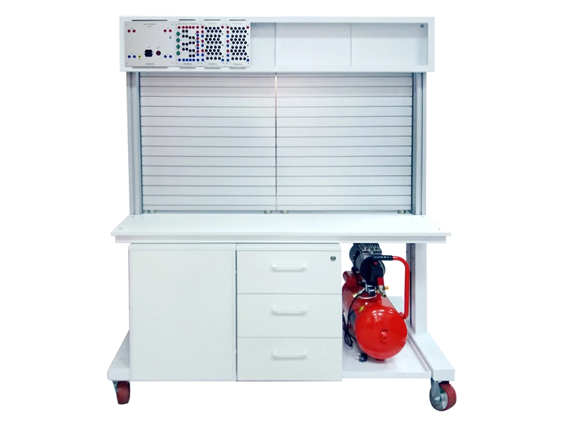Стенд состоит из универсального мобильного лабораторного стола. На столе установлена монтажная плита, предназначенная для закрепления пневматических элементов. В верхней части стола закреплена монтажная рама для установки электронных блоков. На нижней части рамы стола закреплен поддон для установки лабораторного компрессора. Рама стола установлена на колеса для удобства перемещения стенда, два колеса оснащены тормозом.
