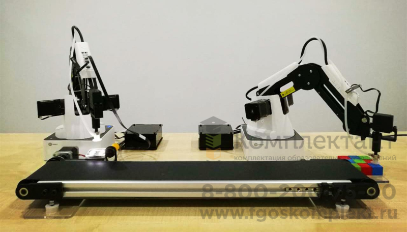 Фотоэлектрический выключатель позволяет определить наличие объекта на ленте, а датчик цвета позволяет классифицировать объекты по цветам. Деревянные кубики используются для демонстрации захвата, перемещения и складирования.