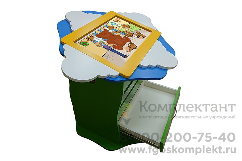 Комплекс оснащен выдвижным ящиком для хранения методических или любых других материалов. Сенсорный экран закрыт ударопрочным закаленным стеклом, что делает использование комплекса безопасным для детей.
