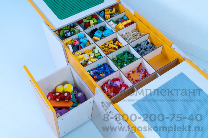 Рабочие поле разделено на 2 зоны, под раздвижными столешницами находятся пластины для сборки конструкторов Lego. Продуманна до мелочей система хранения конструкторов, в ней находится более 1200 деталей Lego Duplo и Classic.