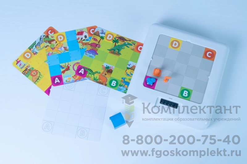 Комплектация: Программируемая магнитная платформа с фигурками, 4 тематические карты с разными маршрутами, Дополнительные “пустые” поля для составления собственных маршрутов, Комплект из 30 карточек с готовыми заданиями, Удобная коробка для хранения