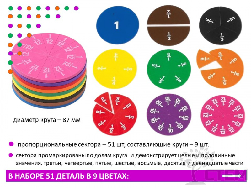 Набор из 51 пропорциональных секторов круга, маркированных по его долям и демонстрирующих целые и половинные значения, третьи, четвертые, пятые, шестые, восьмые, десятые и двенадцатые части, в 9 ярких цветах, напечатанные на каждом круге. Диаметр круга – 87 мм.