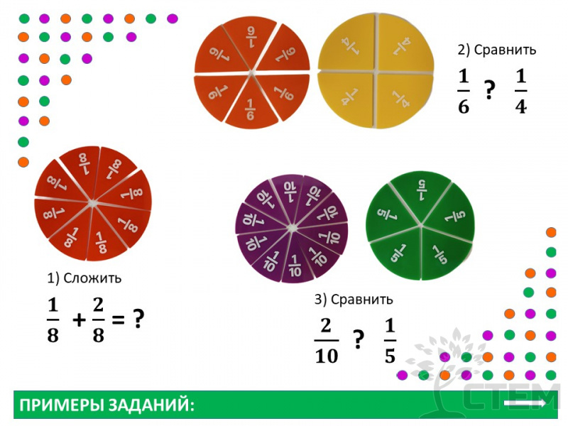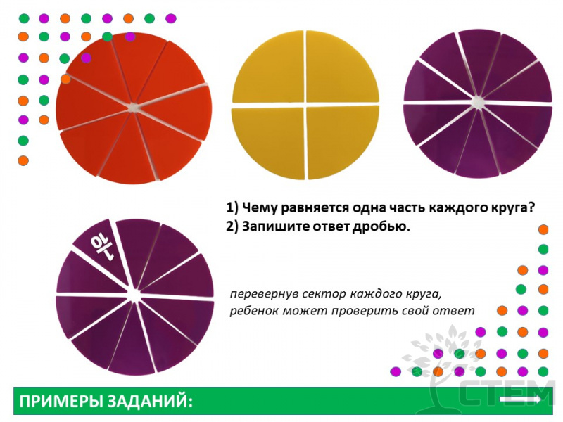 Набор «Круги. Дроби» предназначен для наглядного изучения понятий: "часть" и "целое", для знакомства с дробями.