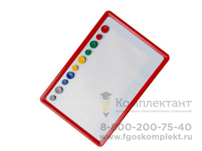 Комплектность: рабочее поле – 1 шт., магнитные кнопки диаметром 15 мм красного, зеленого, желтого, синего и серого цветов – по 1 шт., магнитные кнопки диаметром 20 мм красного, зеленого, желтого, синего и серого цветов – по 1 шт., руководство по эксплуатации – 1 шт.