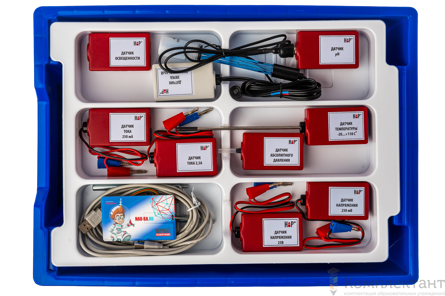 Все оборудование цифровой лаборатории укомплектовано в пластиковую систему хранения, которая закрывается прозрачной пластиковой крышкой на защелках для обеспечения наблюдения за содержимым. Комплект оборудования и датчики в системе хранения располагаются на ложементах в индивидуальных ячейках.