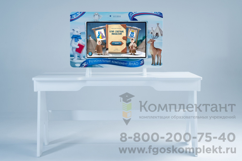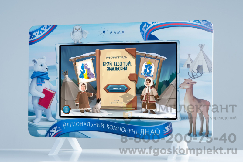 Комплектация: Интерактивная настенная панель 43 дюйма, Программное обеспечение "АЛМА Край Северный, Ямальский" , Печатное методическое пособие по культуре и природе ЯНАО, Программное обеспечение АЛМА Дошкольное Образование версия "Интерактив"; Интерактивная раскраска Оживариум.